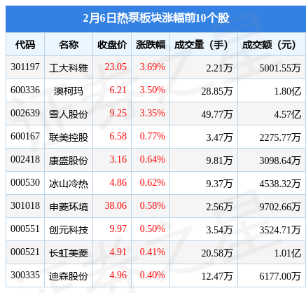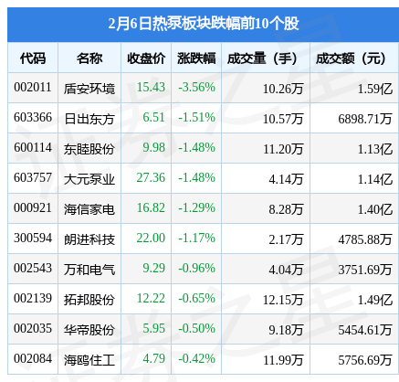 2月6日热泵板块较上一交易日下跌0.35%,盾安环境(002011)领跌。当日上证指数报收于3238.7,下跌0.76%。深证成指报收于11912.56,下跌1.18%。热泵板块个股涨跌见下表: