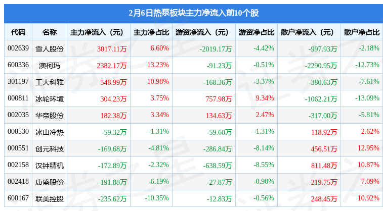 从资金流向上来看,当日热泵板块主力资金净流出4964.8万元,游资资金净流入1582.89万元,散户资金净流入3381.91万元。热泵板块个股资金流向见下表: