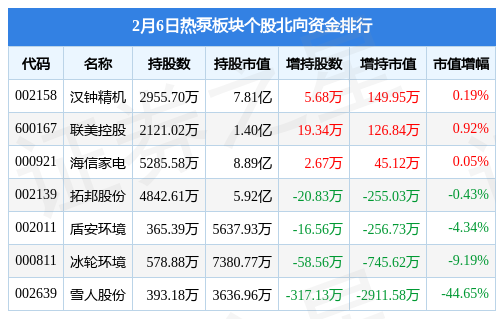 北向资金方面,当日热泵板块北向资金持股市值为25.68亿元,减持0.38亿元。其中增持最多的是汉钟精机(002158),增持了149.95万元。减持持最多的是雪人股份(002639),减持了0.29亿元。热泵板块北向资金持股变动明细见下表: