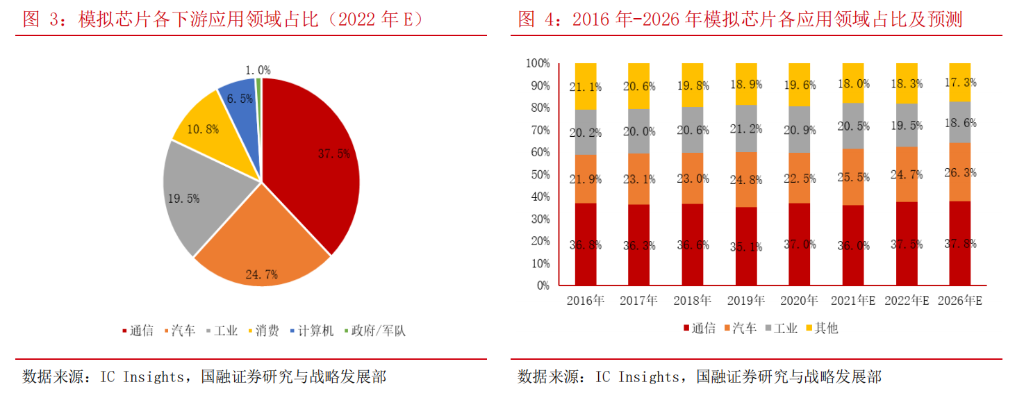 模拟芯片主要由晶体管、电阻、电容等组成,是沟通虚拟信号与现实世界的桥梁,其细分种类繁多,主要包括信号链模拟芯片和电源管理模拟芯片,下游覆盖的行业和应用较为广阔,包括通信、汽车、工业、计算机等各个行业。根据IC Insights数据,通信行业是模拟芯片第一大应用市场,预计2022年市场规模占到模拟芯片市场份额的37.5%。