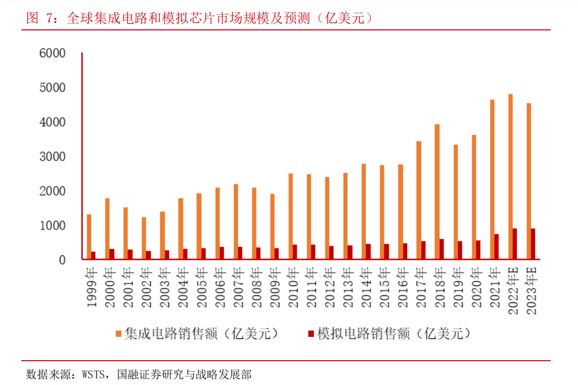 根据WSTS预测数据,预计2023年模拟芯片市场仍将逆势保持增长,全球市场销售额有望增长1.56%达到909.52亿美元,而同期全球集成电路销售额预计将减少5.61%至4530.41亿美元。
