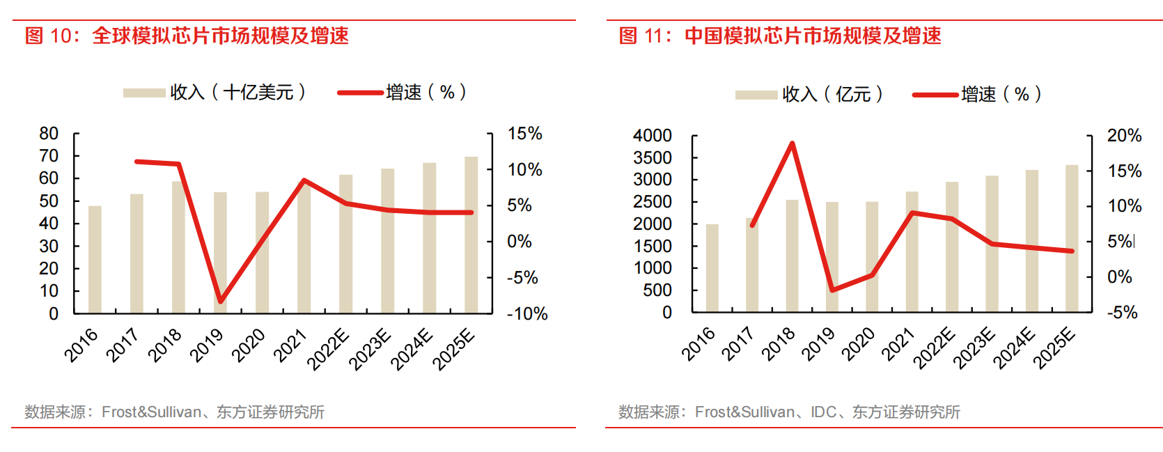 根据Frost&Sullivan统计,2021年中国模拟芯片行业市场规模约2731亿元,占比七成左右,中国为全球最主要的消费市场,且增速高于全球模拟芯片市场整体增速。预计2025年中国模拟芯片市场规模将增长至3340亿元,2020年-2025年复合增长率为6%。