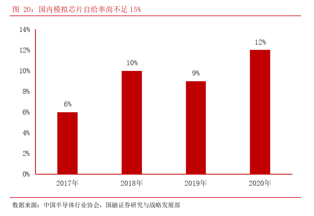 虽然我国是全球最大的模拟芯片应用市场,但由于国内半导体产业起步较晚,国内模拟芯片市场仍由国际巨头公司所垄断,海外厂商占据了超八成的市场份额,国产化率尚处于低位。根据中国半导体行业协会数据,2020年国内模拟芯片自给率仅12%,国产替代空间广阔。