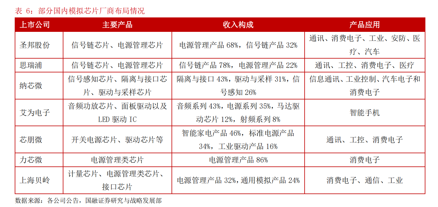 从国内厂商布局来看,近年来,随着政策和下游厂商对国产芯片进口替代支持力度的加大,本土模拟芯片企业与世界先进厂商技术水平的差距逐步缩小,部分国内高端模拟芯片空白得以填补,相继涌现了一批优秀的模拟芯片企业,如圣邦股份(300661)、思瑞浦、艾为电子、纳芯微、芯朋微、力芯微、上海贝岭(600171)等。