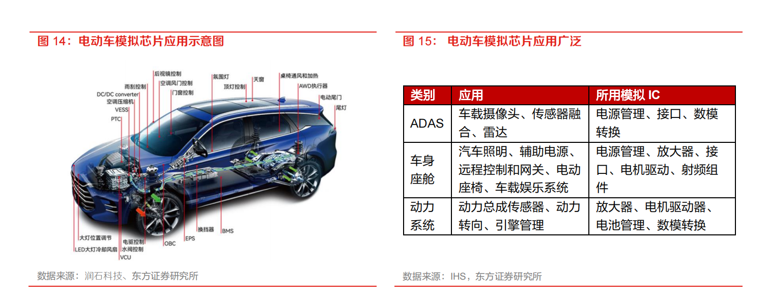 模拟芯片应用于几乎所有汽车电子部件,除了涉及传统汽车电子如车载娱乐、仪表盘、车身电子及LED电源管理等领域,还广泛应用于新能源汽车的动力系统、智能汽车的智能座舱系统和自动驾驶系统。2022年全球汽车专用模拟芯片市场规模将增长17%至138亿美元,是增速最快的模拟芯片下游市场。