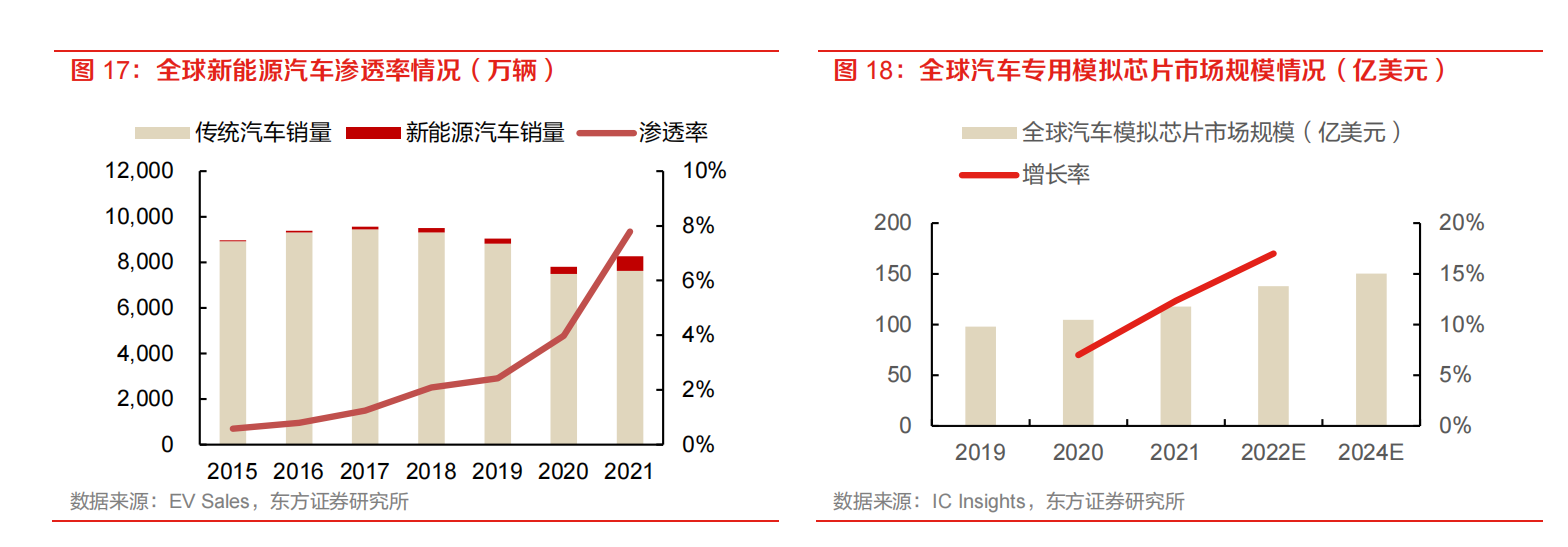 全球新能源汽车销量高速增长,支撑汽车模拟芯片需求稳步提升。在A到E的各个级别汽车中,电动化都大幅增加单车模拟芯片需求量。东方证券(600958)分析师蒯剑等1月30日研报认为,在汽车电动化和智能化趋势带动下,预计全球汽车领域半导体市场需求将保持快速增长,成为驱动模拟芯片需求增长的主要因素。