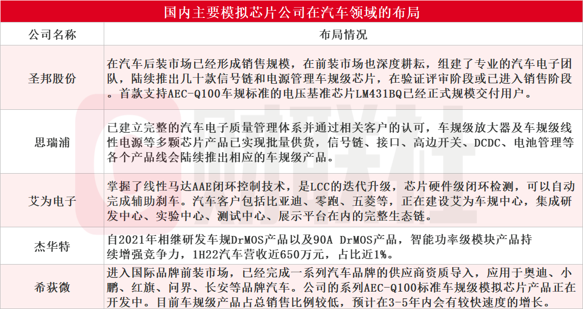 国内模拟芯片公司也纷纷向国际巨头重视的汽车领域进军。例如,纳芯微汽车营收占比在三季度提升至22%,随着相应车规级产品的陆续推出,由汽车领域贡献的营收有望持续提升。国内主要模拟芯片公司圣邦股份、思瑞浦、艾为电子、杰华特、希荻微等向汽车领域扩展情况如下: