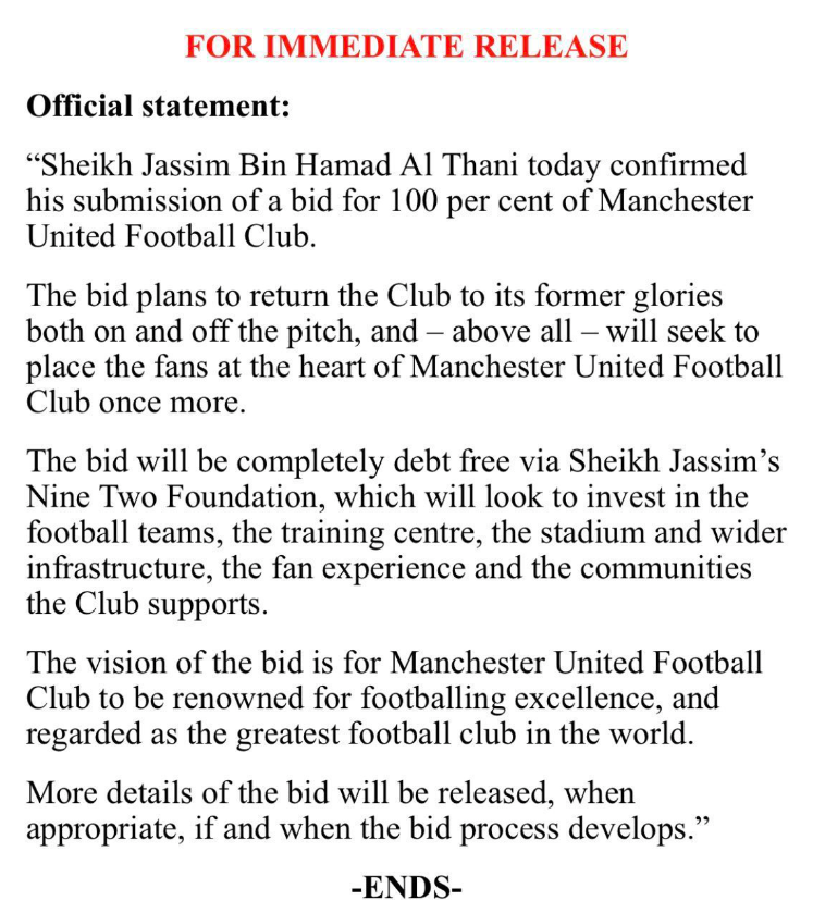根据官方声明,卡塔尔伊斯兰银行(QIB)董事局主席、王室成员贾西姆王子确认已经提交了100%收购曼联的报价。卡塔尔王子将通过新设立的“92基金会”展开收购。财大气粗的卡塔尔富豪强调,这笔交易不会用到任何融资杠杆。